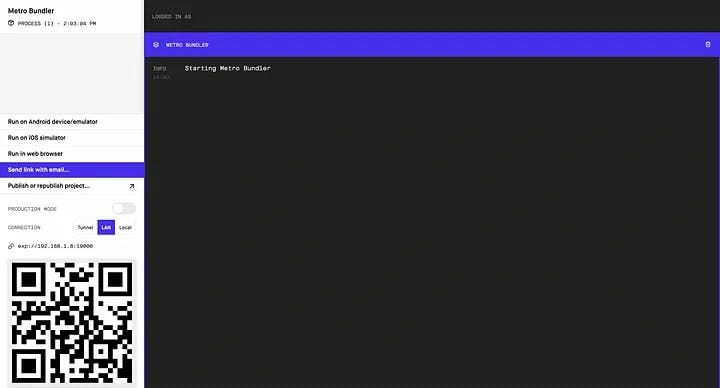 The expo start command will create the js bundle of your whole application and upload it on the expo server, then after scanning the expo server QR code through your phone you can download that JS bundle in your expo mobile app to run it on your phone. Expo creates a metro bundler on the localhost portal to show the building process status. In addition, you can share the application link from Metro Bundler using email and by scanning the QR code as shown in the bottom left corner of the image below.